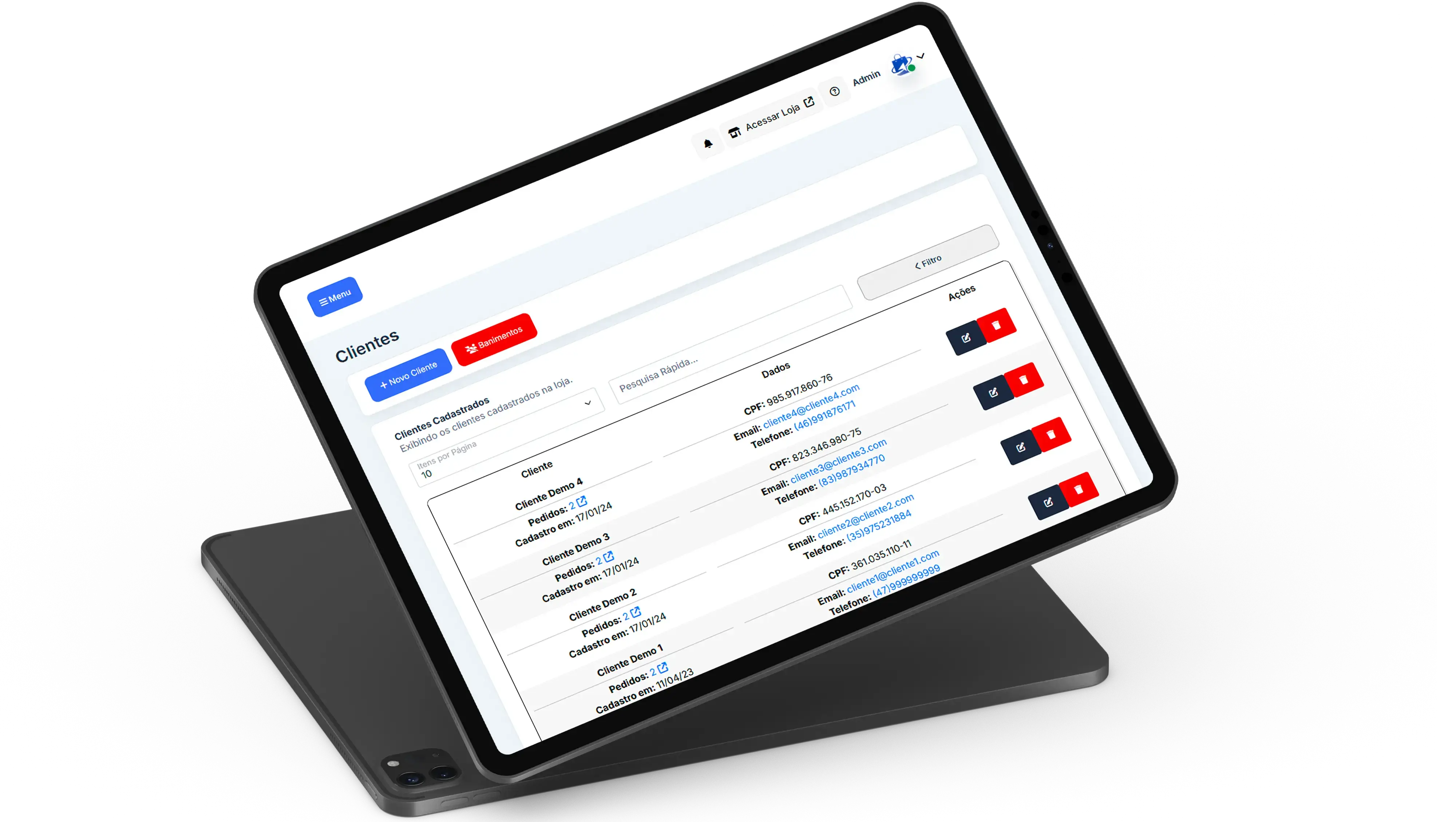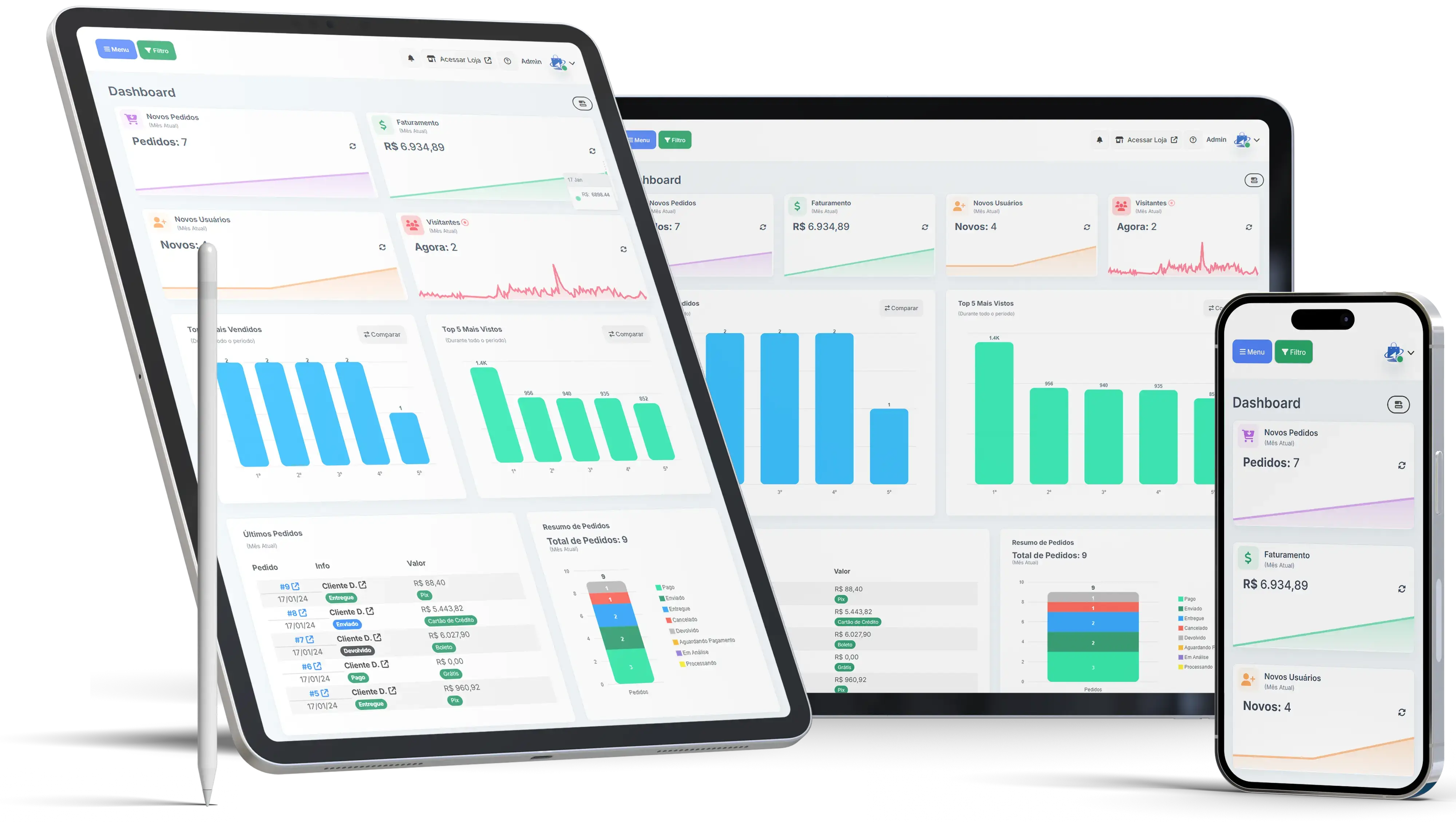 Dashboards, controle vendas, estoque, pedidos, clientes, gestão de fretes, pagamentos e recebumentos e muito mais de forma intuitiva. Tudo pensado para facilitar sua rotina e gestão, com relatórios em tempo real e um painel administrativo que possa ser acessado no seu computador, tablet ou smartphone!